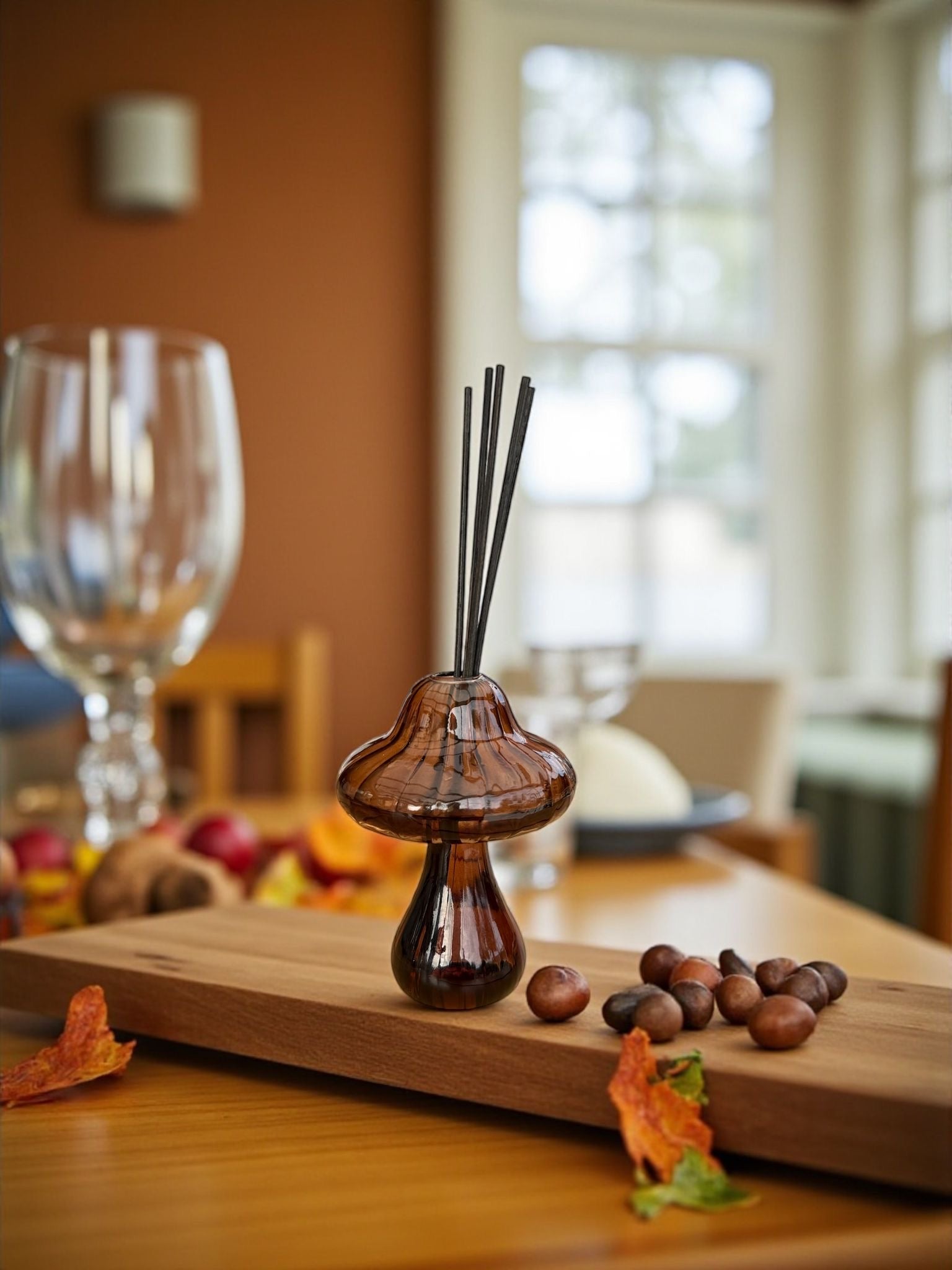 Un diffuseur de parfum en forme de champignon, au verre ambré élégant.
